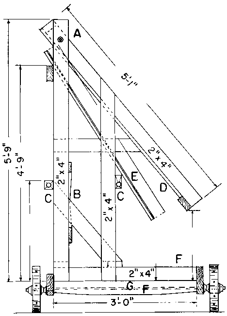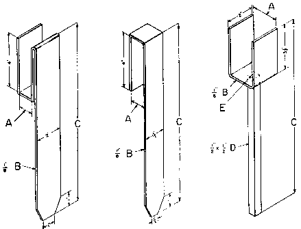 A. Bride métallique de 2 in. x ¼ in. (50 x 6,35 mm).B. Porte-épingles: tube de ¾ in. (19 mm), avec rondelle plate de 1 in. (25,4 mm), soudé à la base pour porter les épingles; longueur, 18 in. (46 mm).