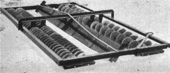 Les toiles de protection doivent être enlevées avant qu'une proportion appréciable des semis, levés en premier, n'aient été aplatis ou n'aient traversé le tissu; par contre, il faut attendre que la majorité des graines aient germé. En pratique, une règle empirique consiste à enlever les toiles lorsque la proportion des graines effectivement levées atteint les deux tiers ou les trois quarts de la faculté germinative indiquée par les essais au laboratoire. Pour éviter la destruction des semis en cours de levée, il faut apporter beaucoup de soin à l'enlèvement des toiles et y procéder en temps voulu. Sous peine d'être dans l'obligation d'en acheter chaque année un nouveau jeu, il faut les nettoyer et les ranger convenablement. On les nettoie en les lavant couramment, on les expose à la pluie en les étalant sur l'herbe ou en les battant, puis on les fait soigneusement sécher. En entreposant des toiles humides, on risque de les voir s'enflammer spontanément. La figure 35 montre un dispositif actionné par tracteur pour brosser et enrouler la toile d'emballage après séchage.