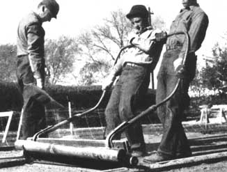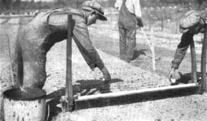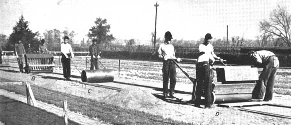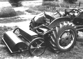 Deux hommes montés sur une remorque basse traînée derrière le semoir peuvent assurer, en même temps, le semis, la mise en place de la toile d'emballage et la pose des épingles. Dans les pépinières de grande étendue, le prix de revient d'un équipement de ce genre trouve sa justification, mais il n'existe pas dans le commerce et on doit le faire construire localement. Le dispositif représenté par la figure 34 a donné toute satisfaction.