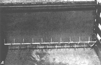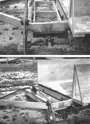 Quelques pépinières utilisent de la sciure de bois, des copeaux ou d'autres matières organiques fines pour jouer le rôle de paillis, mais aussi comme amendement destiné à améliorer la fertilité du sol. Il est très difficile de répartir uniformément ces matériaux lorsqu'on doit les pelleter directement d'un camion ou les épandre à partir des tas qui ont été constitués. La «Forestry Commission» de Georgie a mis au point un dispositif qui se monte sur la porte arrière d'une benne basculante et qu'elle utilise avec succès dans ses pépinières (figures 32 et 33).