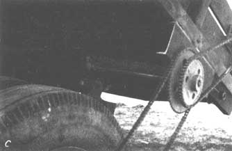 Si on veut utiliser ce dispositif pour étendre le paillis sur la surface des planches de semis, il convient d'ajouter un tamis cylindrique rotatif à axe horizontal qui reçoit le matériau déversé. La longueur du cylindre doit correspondre à la largeur de la benne; son diamètre doit être de 10 inches (25 cm) environ. Il peut être réalisé avec un treillis métallique aux mailles de ¼ à ½ inch (6,3 à 12,7 mm), et monté sur un axe horizontal reposant sur des paliers fixés au châssis du camion. Un engrenage et une chaîne montés sur l'entraînement de la roue (figure 33) déterminent la rotation du cylindre au fur et à mesure du déversement du paillis qui le traverse. On peut ainsi répartir un paillis assez uni et régulier.
