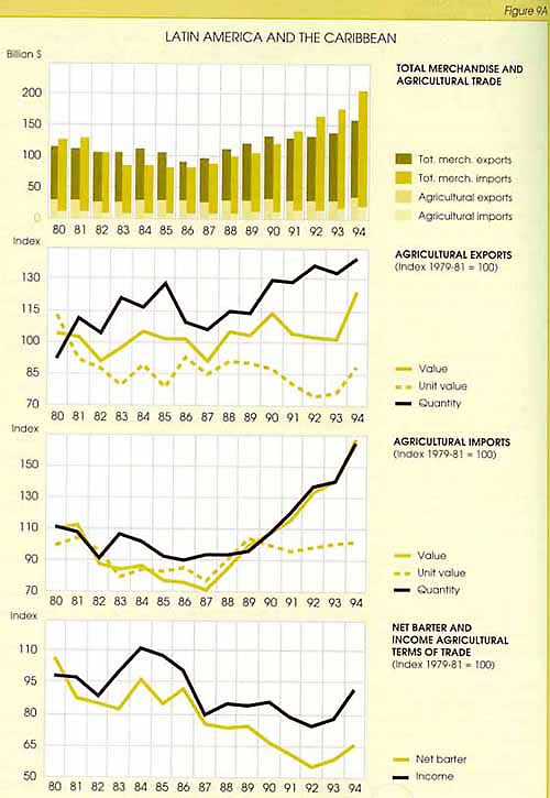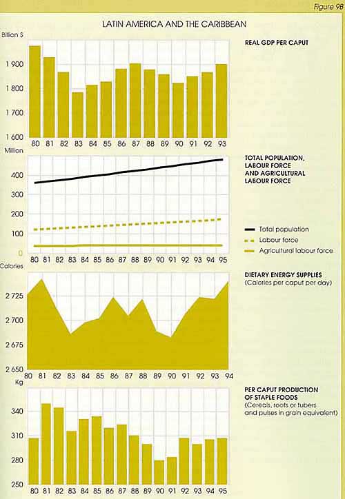 The economic environment in Latin America and the Caribbean in 1995-96 has been strongly influenced by the effects of the financial crisis that took place in late 1994 in Mexico and successively in Argentina. The deep recession that followed the crisis in these two countries was largely responsible for a significant slow-down in the region's rate of GDP growth. The reduction of capital flows to the region was not as pronounced as initially feared, however; growth in most other countries slowed only slightly, inflation continued to decline - with the major exception of Mexico - and exports remained buoyant. Nevertheless, there are concerns over current account deficits which, particularly in Brazil, have reached extremely high levels, as well as over the sustainability of capital inflows, competitiveness problems linked to currency overvaluation and the deteriorating social conditions in several countries. In this general context, the performances of regional agriculture have remained disappointing despite remarkable success stories, particularly in the agro-export sector, in some countries.