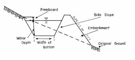 Cross-sections: The cross-sections are determined by the amount of runoff, the designed velocity of the flow, and shape and side slopes of the diversion ditches. The following formula can be used: