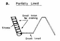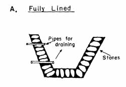An earth trench is much cheaper than a stone-lined one. For the drainage type, it may be more economical and practical to line only the up slope and/or the bottom. An earth trench is usually sufficient for the filling in type. Its cost depends largely on the kind of filling material and the method used.
