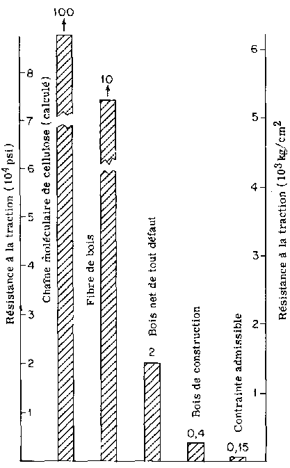 La figure montre comment l'une des propriétés prééminentes du bois, la résistance à la traction parallèle au fil du bois, varie depuis le niveau moléculaire jusqu'à la valeur très dépréciée avec laquelle les ingénieurs doivent travailler, au niveau, par exemple, des bois d'uvre. L'espèce choisie ici est le sapin Douglas, essence d'élite pour la construction aux Etats-Unis. Il est intéressant de remarquer que la chute se produit surtout au-dessus du niveau de la fibre, là où les besoins de longues pièces rectangulaires font que certaines caractéristiques naturelles, nuds et contre-fils deviennent des défauts. Et, qui plus est, la variabilité du matériau impose un lourd tribut au calcul statistique de la contrainte admissible.