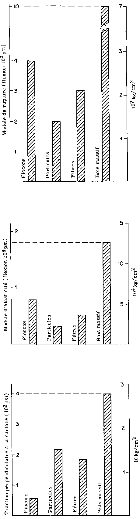 La géométrie de, élément, est à l'origine d'importants raffinements apportés à la maîtrise des propriétés des matériaux dérivés du bois. La figure 5 montre les niveaux de résistance que l'on peut obtenir de trois éléments différents: flocons, particules et fibres, par comparaison avec le bois ordinaire de sapin Douglas dont la résistance peut être considérée comme une bonne référence. Ainsi les flocons ont un module de rupture et un module d'élasticité élevés, mais de faibles valeurs en traction perpendiculaire à leur surface. Les particules en revanche donnent des valeurs élevées de traction perpendiculaire à la surface, mais de faibles valeurs pour les deux autres propriétés. La figure 6 montre qu'en combinant ces éléments de façons diverses dans des couches distinctes, on peut, dans un même produit, obtenir de chacun des éléments sa meilleure performance.