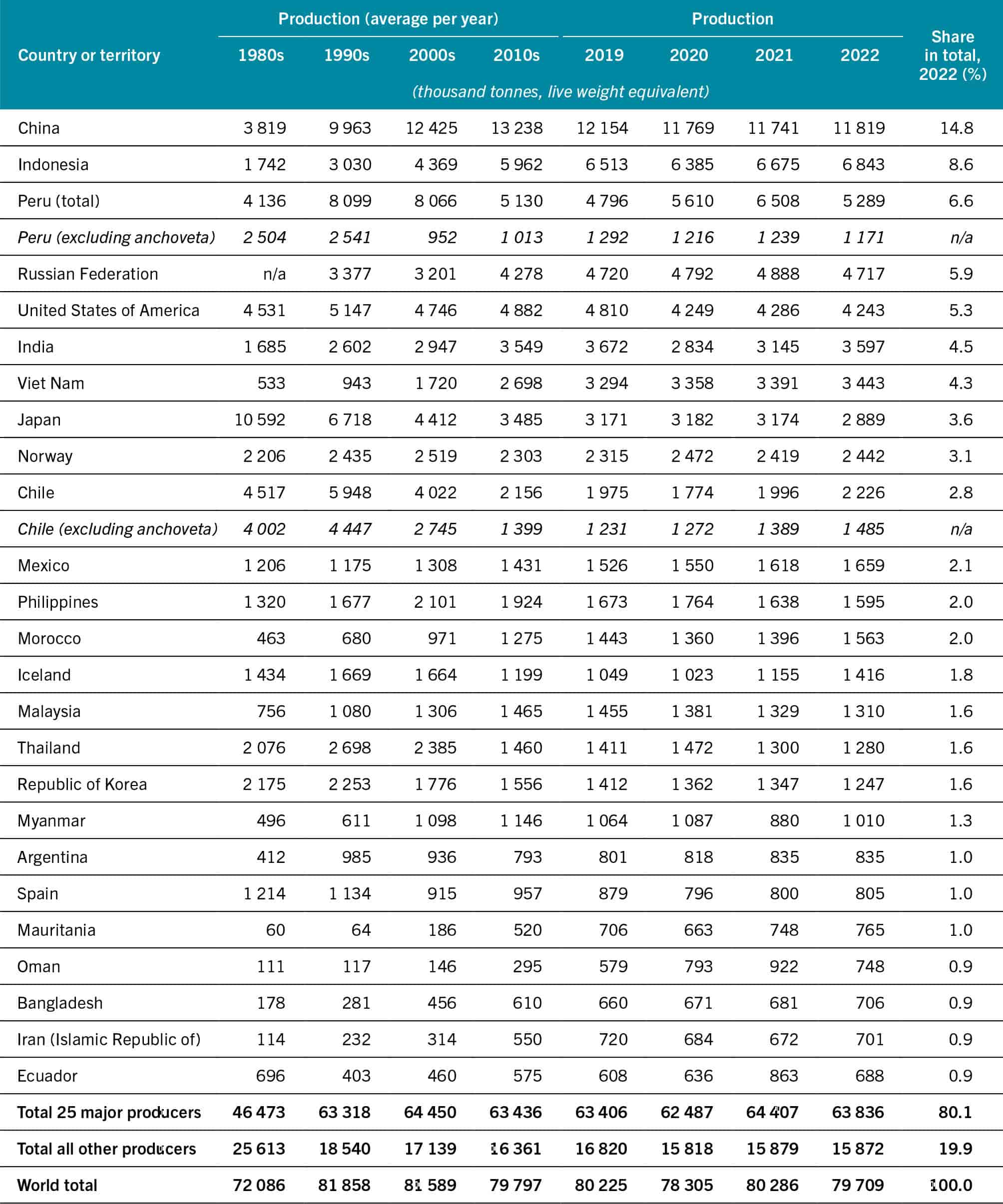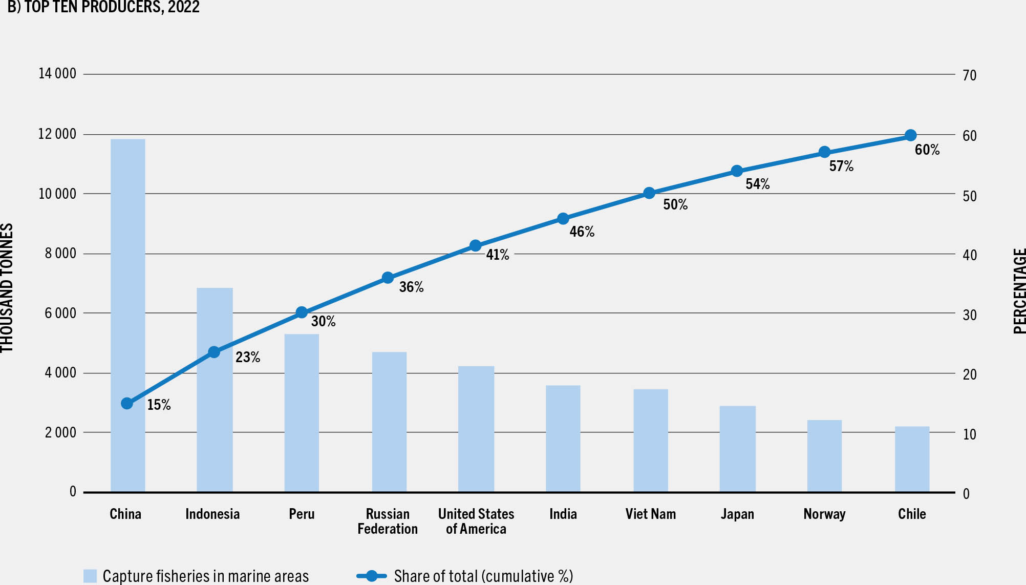Despite the ubiquitous nature of fishing in marine areas, production is concentrated in a small number of countries (Figure 14a). As in previous years, the top seven producers in 2022 accounted for 50 percent of total marine captures (Figure 14b). China alone accounted for 14.8 percent of the world total, followed by Indonesia (8.6 percent), Peru (6.6 percent), the Russian Federation (5.9 percent), the United States of America (5.3 percent), India (4.5 percent) and Viet Nam (4.3 percent) (Table 6).