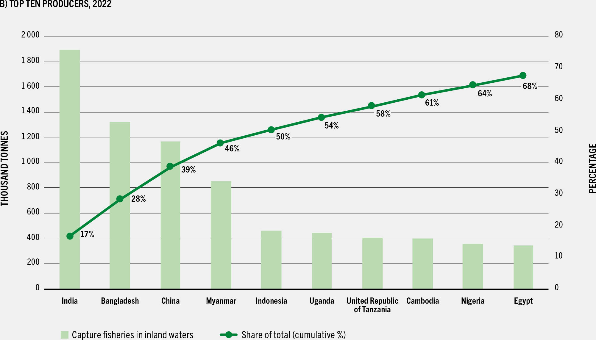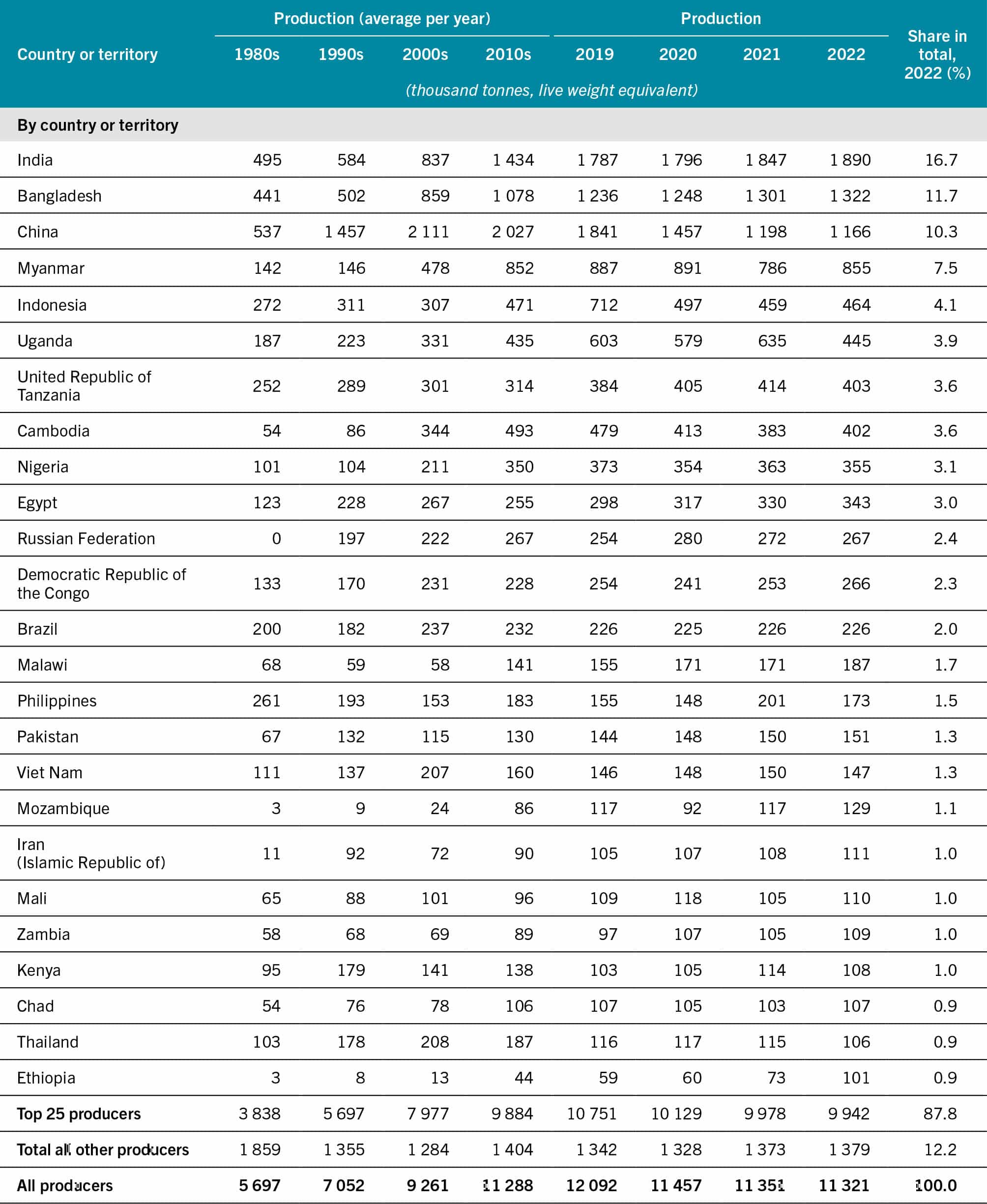 With the exception of China, the relatively modest growth in inland water catches in recent years has been driven by increasing production among several of the major producing countries – notably Bangladesh, India and the United Republic of Tanzania.
