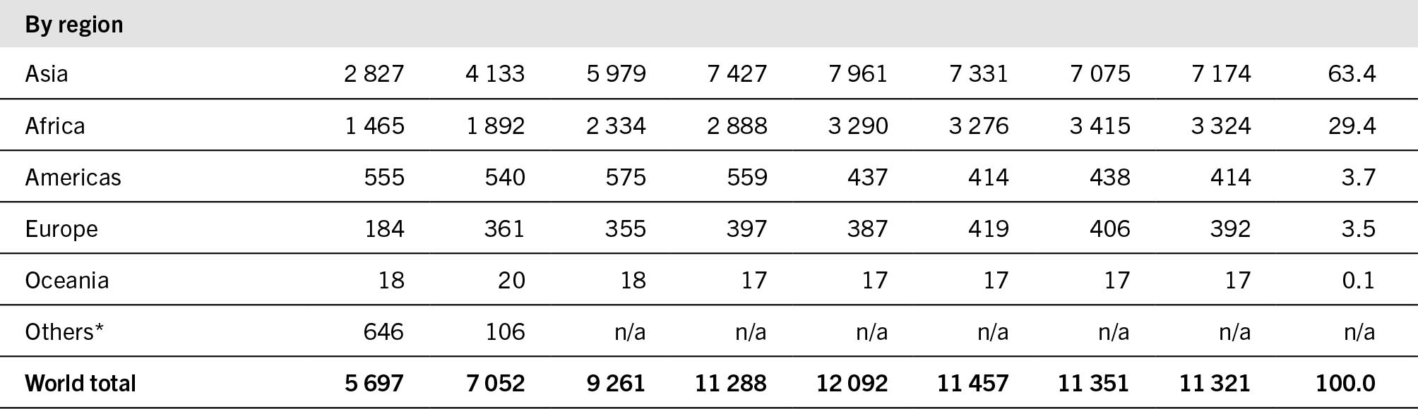 The lack of species granularity available for inland water capture fisheries is a persistent and longstanding issue. Despite improvements in the monitoring of inland waters by many countries, 50 percent of global inland water capture production is available only at the highest level of aggregation of the so-called freshwater fishes nei (Actinopterygii) – a figure that has remained largely unchanged in the last 20 years. This proportion of unidentified catches, however, varies significantly between countries and regions, ranging from as low as 10 percent for Europe to over 60 percent for some countries in Asia.