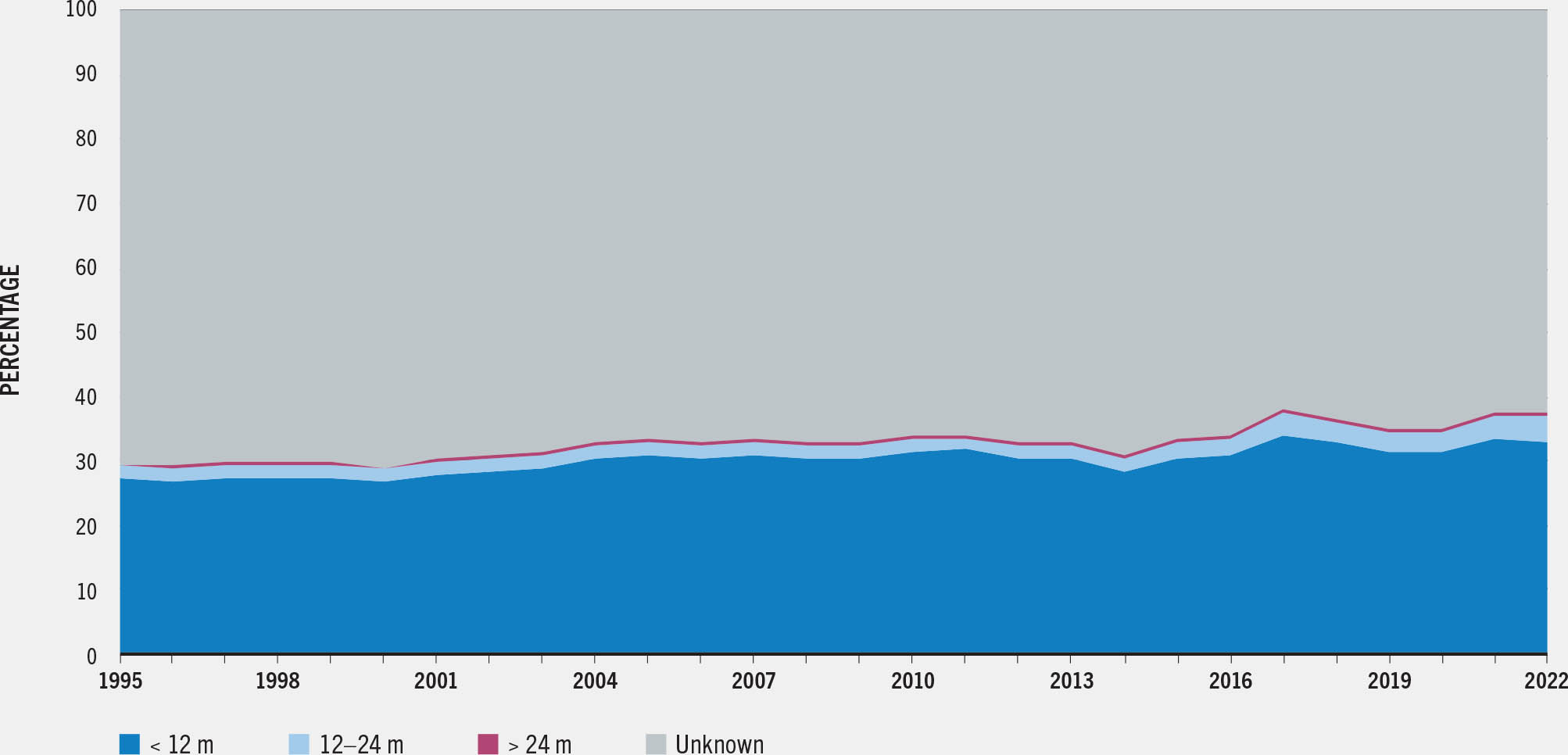 Information on the size of vessels is available for only 37 percent of the total vessels reported. This information is not available for the three countries with the world’s largest fleets that accounted for nearly half of the global fishing fleet in 2022 – China, Indonesia and the Philippines. Among those vessels for which information on length overall (LOA) was available in 2022, 89 percent were in the LOA class of under 12 m, 10 percent in the LOA class of 12 to 24 m, and 2 percent in the LOA class of over 24 m. Figure 25 and Figure 26 show a gradual increase in the information on size and indicate that the share of small vessels has been decreasing since 2010.