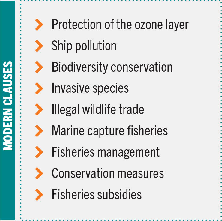 At the request of its Members, FAO is developing a database of RTAs for fisheries and aquaculture products. The database is designed to increase transparency and knowledge about “modern clauses” in RTAs (see figure), considering their complexity; it also aims to facilitate preferential access, with a particular focus on developing countries and small-scale operators. The database thus seeks to mitigate the existing information gap on the topic and promote trade agreement discussions with the benefit of increased international responsible trade flows. The inclusion of these “modern clauses” in RTAs underscores the importance of the adoption of relevant international instruments such as the FAO Port State Measures Agreement (see p. 146), the FAO Code of Conduct for Responsible Fisheries and the WTO Agreement on Fisheries Subsidies (see p. 168).