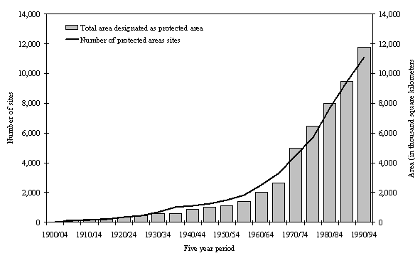 Figure 5 shows the growth in the number and total area of legally protected areas between 1900 and 1994.16 Historically, the number and area of protected areas has increased by around 8% each year. This has slowed down somewhat in recent years and annual growth in the area of legally protected areas is currently a little over 4% while growth in their number is about 3%. This amounts to an increase in the global area of legally protected areas of around 150 million ha to 200 million ha every year.