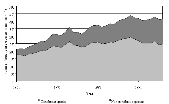The other major raw material change which has occurred in the last few decades is the growing acceptability of hardwood species for pulp production. Traditionally, softwood species have always been preferred for pulp production due to their long fibre length and strength. However, improvements in the pulping process have enabled hardwoods to take a greater share of this market in recent years. For example, Figure 8 shows that the proportion of non-coniferous pulpwood production in total pulpwood production has increased from less than 20% in 1961 to 40% in 1997.