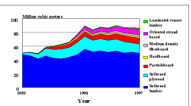 Figure 9 shows the increasing role that engineered wood products have played in the markets for solid wood products in the United States from 1950 to 1997. As the figure shows, a considerable amount of the growth in production of solid wood products over the last four decades has been met by development of these new products. In contrast, sawnwood production has remained relatively static and plywood production, while growing at first, has declined in recent years.