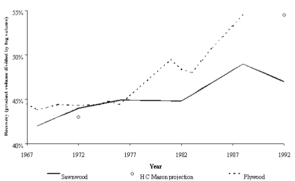 These improvements have helped to push product recovery rates (i.e. the volume of sawnwood produced from a given volume of roundwood) up in the North American sawmilling industry over the last 30 years. For example, Figure 10 shows that product recovery rates in the Western United States of America increased from 42% in 1968 to 47% in 1992. This was slightly below projections made in 1973 (H C Mason and Associates, 1973), but these improvements have been made against a background of slowly deteriorating log size and quality in the region. However, it does mean that, for each cubic metre of wood input, mills in this region managed to produce 0.5% more sawnwood output on average each year over this period. This rate of growth in recovery (0.5% per annum) may not seem like much, but it must be remembered that the projected growth to 2010 of sawnwood production in North America shown earlier is also only a small figure (0.7% per annum).