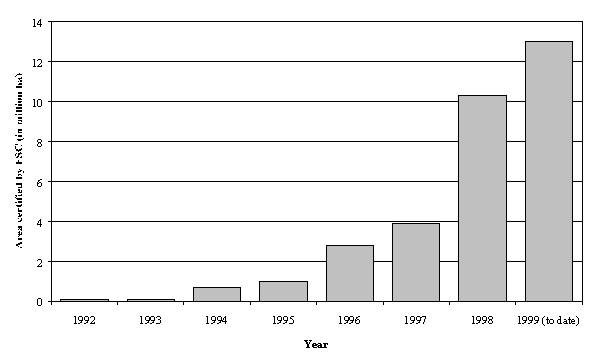 Of all the forest certification schemes, the FSC certification scheme is probably the most well-known. The area now (January 1999) certified by the six independent companies working to FSC guidelines has just reached 13 million ha (see Figure 11). This is still, however, only a tiny fraction of the total area of forest used globally for wood production each year (several hundreds of millions of hectares). The World Wildlife Fund (WWF) and World Bank have, as part of their strategic alliance announced in 1998, agreed to pursue a goal that 200 million ha of forest will be certified by the year 2005. This will present a major challenge, particularly if they want to include a significant proportion of certified tropical forests in this total (see, for example, Box 7, which presents a much less optimistic view of the future for certification).