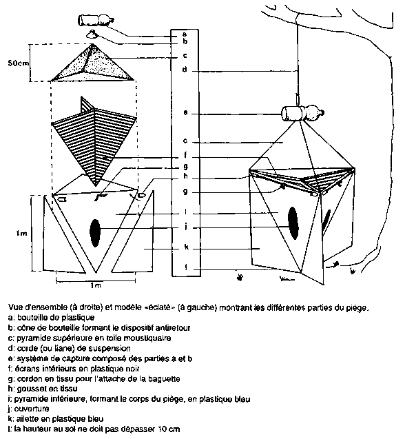 Ce piège n'a ni arceau métallique, ni cône de métal (figures 1 et 2). Sa forme est donnée par trois baguettes de bois de 1 m environ. Les baguettes sont amovibles, maintenues par un gousset de tissu aux deux extrémités. Le piège est suspendu: il ne nécessite donc pas de piquet de métal. Il pliable (un piège tient dans une enveloppe de 21 x 29,7 cm) et donc facilement transportable. Il n'est pas imprégné d'insecticide.