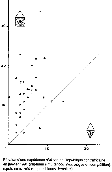 Avec un système de capture identique, ce piège montre une efficacité supérieure aux autres pièges de type monoconique, monopyramidal et biconique (voir le tableau). Les caractéristiques de ces différents pièges sont données par Gouteux et al., (1991). La figure 3 présente de façon synoptique le bilan de tous les essais comparatifs effectués selon divers protocoles (Gouteux et al., 1991). La position des points par rapport à la bissectrice (ligne pointillée indique la supériorité de l'un ou l'autre piège lors de chaque essai. Seuls trois essais n'ont pas révélé de différence notable (points situés près de la bissectrice); par contre, l'ensemble atteste une plus grande efficacité du piège bipyramidal, égale à 145 pour cent de celle du piège biconique (1 568 G. fuscipes capturés contre 1 080; t12ddl = 3,94; 0,005 >p > 0,001). La cohérence de ces diverses expériences est confirmée par la bonne corrélation observée (R2 = 0,76). Une autre expérience a consisté à mettre 22 pièges dans une galerie forestière très ombragée (11 pièges biconiques et 11- pièges bipyramidaux) en plaçant les pièges de chaque type en vis-à-vis, distants de 15 à 25 m, et en alternant chaque jour leur emplacement. Les résultats des captures journalières pour les G. fuscipes mâles et femelles sont présentés à la figure 4. Les captures réalisées à l'aide du piège bipyramidal ont été dans ce cas plus du double de celles du piège biconique (486 G. fuscipes contre 193; t17ddl = 6,66; p < 0,001), le ratio sexe ne présentant pas néanmoins de différence significative (45 et 47 pour cent de femelles pour les pièges biconique et bipyramidal respectivement, CHI2 = 0,36).