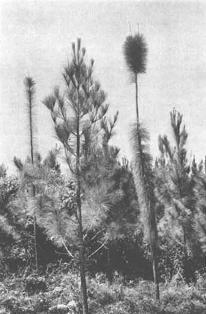 FIGURE 3. - Five-year-old normal branched trees and branchless foxtail forms.