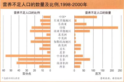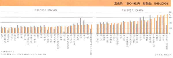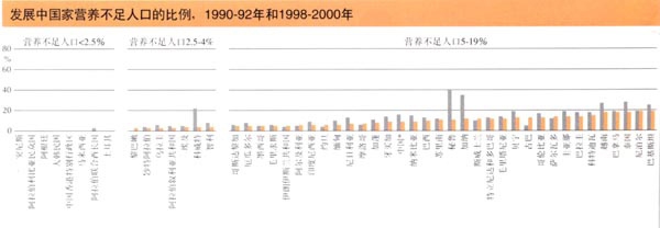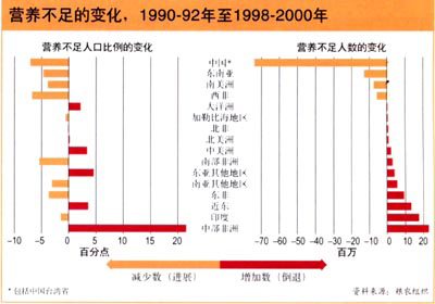 如同东南亚和南美洲那样,西部非洲在减少营养不足的发生率和人数上取得了显著的成绩。但是中美洲、近东和东业(中国除外)的形势却特别黯淡,其营养不足的发生率和人数均巳上升。
