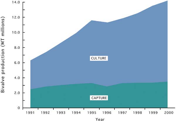 Bivalve molluscs (oysters, mussels, clams and scallops) form a significant part of the worlds fisheries production. In 2000 landings of bivalves from capture fisheries and aquaculture operations totalled 14 204 152 tonnes (Figure 1). During the decade from 1991 to 2000 there was a continuing increase in production of bivalves, and landings more than doubled from 6.3 million tonnes in 1991 to 14 million tonnes in 2000.