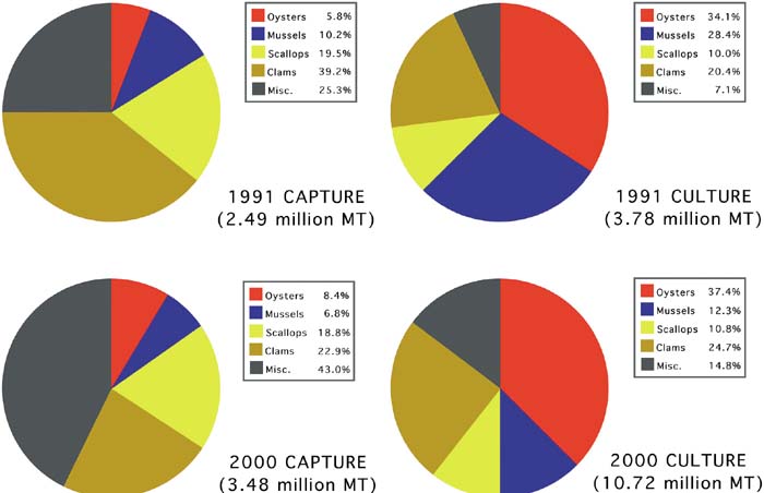 Figure 2: A comparison of production from capture fisheries and aquaculture broken down into the relative contributions of the major groups of bivalves in 1991 and 2000.