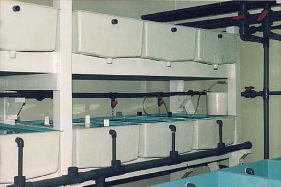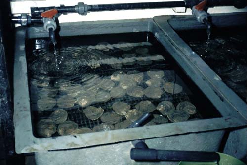 It is also feasible to condition bivalves in recirculation systems where the total live weight biomass of adults (the collective weight - shells included - of all the animals in the tank) does not exceed 2 or 3 g per l. In this case, it is advisable to drain and refill the total volume of water in the system at least twice each week to prevent build-ups of bacteria and metabolites.
