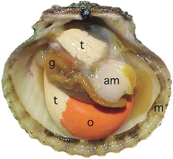 Figure 33: The anatomy of a fully mature calico scallop (Argopecten gibbus): am - adductor muscle; g - gills (raised to reveal the gonad); m - mantle; o - ovary; t - testis.