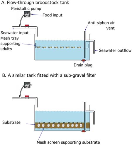 Adults taken from the sea are brought into the hatchery, their shells thoroughly scrubbed and rinsed to remove epifaunal (fouling) organisms and sediment, and then placed in tanks similar to those shown in Figure 35 (see also Figure 32). Clams and also scallop species (e.g. Pecten ziczac) which are normally partially buried in the substrate in nature, feed more efficiently if they are kept in a suitable substrate. In tanks of the type illustrated, clams or scallops are allowed to bury in 10 cm deep trays filled with coarse sand or shell gravel, or in a sufficient depth of substrate over a sub-sand filter (Figure 35B). Trays are supported off the bottom of the conditioning tank when stocked with bivalves that do not require a substrate, e.g. oysters, mussels and some scallop species (Figures 35A and 36).