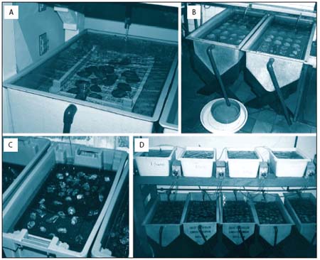 Figure 36: A to D - Examples of various types of flow-through tanks used for broodstock conditioning. The tray under the outflow in B - contains a mesh-based sieve, used to retain European flat oyster larvae that may otherwise be lost in the tank discharge when liberated by the adults. C - is an experimental system with each broodstock tank supplied a different diet by peristaltic pump from the reservoir tanks alongside.