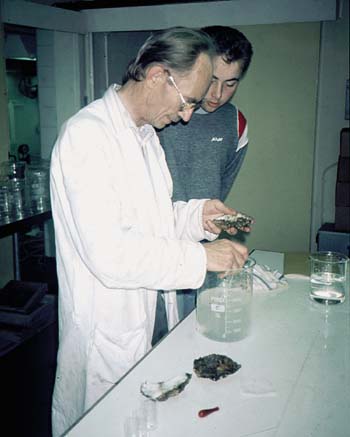 As each female begins to spawn it is necessary to remove it from the spawning trough and transfer it to an individual spawning dish or beaker part-filled with filtered seawater at 24-26ºC (Figure 46). The dishes/beakers are contained in a heated waterbath to maintain the temperature. The same procedure applies to spawning males, which can be identified as such by the continuous stream of milky fluid escaping from the exhalant siphon compared with the granular appearance or clumps of eggs shed by a female. Females may start spawning as much as 30 to 60 minutes after the first male begins to liberate sperm.