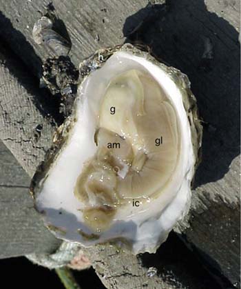Figure 40: Anatomy of a developing flat oyster, Ostrea edulis; am - adductor muscle; g - gonad tissue overlying the digestive gland; gl - gills; h - hinge; ic - inhalant chamber of mantle cavity. At spawning, eggs pass through the gills into the inhalant chamber of the mantle cavity where they develop to fully shelled larvae over the course of a week or more, depending on species. The parent releases larvae when they are able to ingest and digest algae. (The anatomy of oysters of the genera Tiostrea and Ostrea is essentially similar).