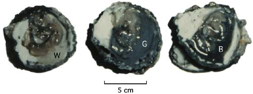 Figure 41: Brooding stages of the European flat oyster, Ostrea edulis. W - the "white sick" stage shortly after eggs are passed to the inhalant chamber of the mantle cavity; G - the "grey sick" stage, beyond the trochophore stage, when the shell valves are well developed but the larval organs not yet fully developed (3 to 5 days after spawning); B - the "black sick" stage at which larvae are almost fully developed and are ready to be released. White, grey and black "sick" are traditional terms applied to brooding oysters in Europe.
