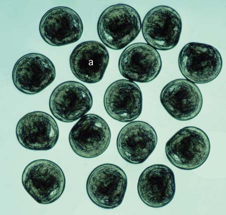 When first spawned the eggs are pear-shaped but they rapidly hydrate and assume a spherical shape when in contact with seawater. Eggs from different females are collected separately to provide opportunity to visually assess quality using a microscope at about x100 magnification. Batches of eggs that do not round off after about 15 to 20 minutes in seawater should be discarded. Reproductive development in the females of oviparous bivalves is not completely synchronous so that at any point in time eggs spawned by different females will be at slightly different stages of maturation. When separation and examination of the eggs is complete, batches of eggs that appear good can be pooled in a larger volume container.