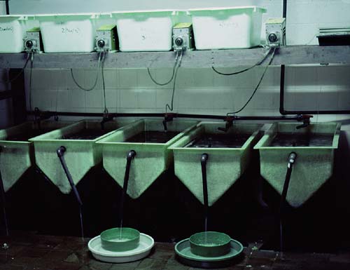 In calculating ration, account needs to be taken of the configuration of the tanks and system in which the adults are conditioned. This is not of particular concern in closed systems where algal cells, as yet uneaten, are not lost other than through sedimentation or settling on surfaces. In flow-through systems and tanks of the type shown in Figures 32, 36 and 37, however, a proportion of the algae fed will inevitably be uneaten and will be lost in the outflow. For this reason, adequately stocked tanks of 100 to 150 l with slow rates of water exchange are preferred.