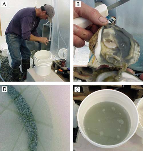 Figure 44: A - Stripping Ostrea edulis larvae from a brooding adult. B - The top (flat) shell valve is removed, then the brooding larvae are washed through a 90 µm sieve balanced over a bucket of filtered seawater (C). D - Most of the larvae swim rapidly to the water surface where they aggregate (raft) together. They are then ready to be sampled for counting and for size determination. Photographs were taken at the Harwen Oyster Farm hatchery in Nova Scotia (courtesy John and Krista Harding).