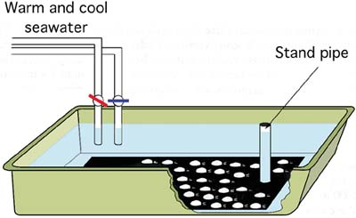 The trough is often fitted with a standpipe drain and two filtered seawater supplies, one heated or chilled to 12 to 15ºC and the other at 25 to 28ºC (e.g. for Crassostrea species and Manila clams). Lower temperatures apply to cooler water species. The importance is the differential between the lower and higher temperature, which will normally be about 10ºC.