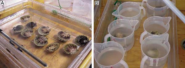 Figure 46: A - Pecten ziczac adults undergoing thermal cycling in a spawning tray. Note the aquarium heater used to maintain the elevated temperature. A similar tray of water is chilled with ice packs to provide the cold shock. B - Individual scallops spawning in 3 l plastic beakers immersed in a constant temperature water bath. While this species is not dioecious, the illustration applies to procedures used in spawning any species.
