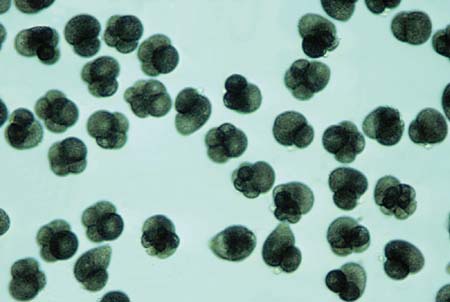 Within this time period, at the appropriate temperature for the species, the fertilized eggs will begin to divide, first almost equally into two cells and then unequally into 4 cells where one large cell will be observed capped by 3 much smaller cells. The first sign of successful fertilization, however, before cell division starts, is the extrusion from the egg of a small, transparent, dome-like structure, which is the first polar body (Figures 48 and 49). Assessment of the percentage of eggs developing normally can be made using a relatively low power microscope (x20-40 magnification). Fertilization rates almost invariably exceed 90% assuming the eggs are fully mature.
