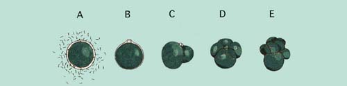 Figure 49: Stages in the early development of eggs; A - sperm swarming around a rounded-off egg; B - extrusion of the first polar body following fertilization; C - two-cell stage also showing the second polar body; D - four-cell stage; E - eight-cell stage. The eggs of most oviparous bivalves range in size from about 60 to 80 µm, depending on species. The time from fertilization to the various developmental stages is species and temperature dependent.