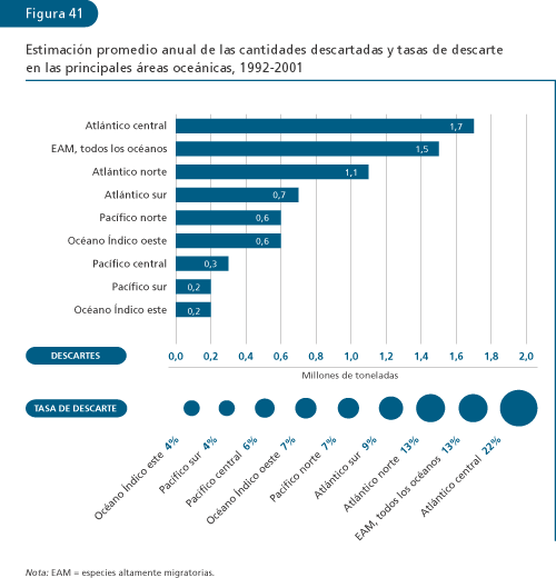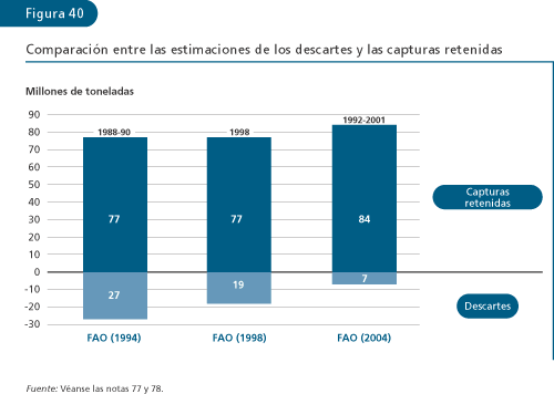 78 Las fuentes de las estimaciones mencionadas en este párrafo son, respectivamente: FAO. 1994. A global assessment of fisheries bycatch and discards, por D.L. Alverson, M.H. Freeberg, S.A. Murawaski y J.G. Pope. FAO Fisheries Technical Paper No. 339. Roma; FAO. 1998. El estado mundial de la pesca y la acuicultura 1998. Roma; y D.L. Alverson. 1998. Discarding practices and unobserved fishing mortality in marine fisheries: an update. Report prepared for the NMFS. Washington Sea Grant Publication WSG 98-06. Seattle, Washington, Estados Unidos, Washington Sea Grant.