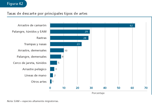 Las pesquerías de arrastre del camarón y peces demersales representan más del 50 por ciento de los descartes totales estimados, mientras que suman aproximadamente el 22 por ciento de los desembarques totales, según la base de datos de los descartes. Las pesquerías de arrastre del camarón en zonas tropicales tienen la mayor tasa de descartes y, por sí solas, representan más del 27 por ciento del total estimado. Las pesquerías de camarones penéidos de Indonesia, América del Sur y Estados Unidos realizan en conjunto 1 millón de toneladas de descartes aproximadamente. Las pesquerías de camarón de arrastre de aguas frías tienen tasas de descartes notablemente inferiores. Sin embargo, las tasas de descarte pueden variar de más del 80 por ciento en algunas pesquerías de arrastre de cigalas a menos del 6 por ciento en muchas pesquerías de camarones pandálidos.