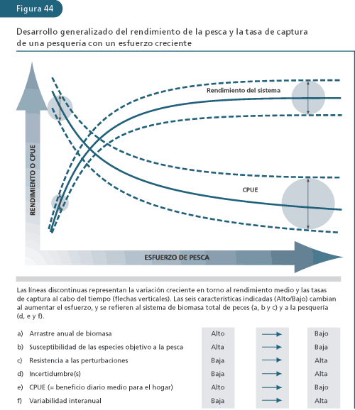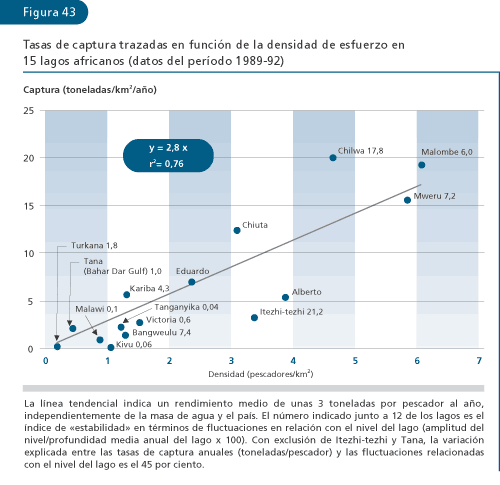 En todos los enfoques de ordenación se asigna una función importante al esfuerzo de pesca al explicar y predecir los cambios en la regeneración de las distintas poblaciones ícticas. Pero en muchos países africanos, ha tenido poco éxito el establecimiento de límites a la mortalidad por la pesca basándose en modelos clásicos de evaluación de poblaciones. A este fracaso contribuyen varias razones intrínsecas a la variedad del ecosistema. En los lagos estudiados parece que las fuerzas ambientales son en muchos casos más importantes que los cambios en el esfuerzo para explicar los cambios en la producción de pescado. Los rendimientos totales de las pesquerías de especies y aparejos múltiples son sorprendentemente estables con una gama muy diferente de esfuerzo, pero se producen cambios considerables en la composición por especies y tamaños como consecuencia tanto de la pesca como de procesos de origen ambiental. Muchas poblaciones son resistentes y tienen gran capacidad de recuperarse cuando cede la presión. Se ha encontrado que las variaciones en los niveles de esfuerzo reflejan en cierta medida las variaciones en la productividad de los ecosistemas (Figura 43), y no viceversa, como suponen los modelos clásicos.