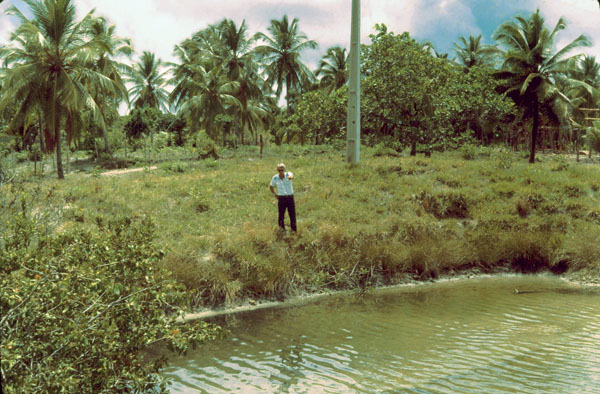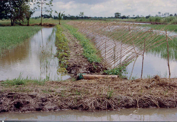 图49 种有椰子树、草和香蕉树的池塘堤岸;除了起到固堤的作用,它还是一种综合作业的形式(泰国)
