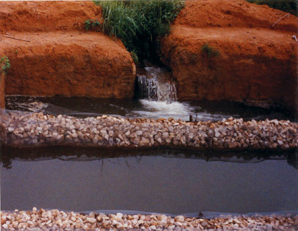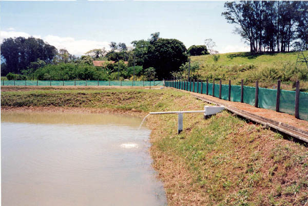 图54 在池塘水位之上供水可提供一些增氧效果,而种草则减少池塘堤岸的侵蚀(巴西)