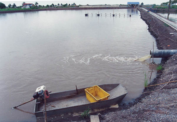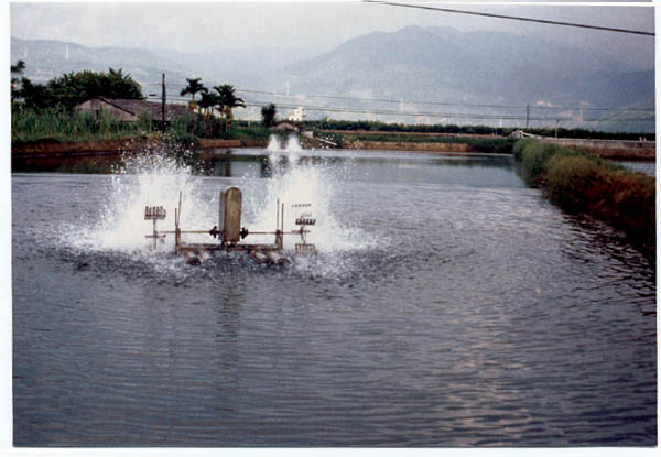 大多数养虾场利用水交换的方法来保持溶解氧的高含量和处理其他水质方面的问题。粮农组织在1982年首次编写有关淡水虾养殖的手册时便指出,在自流水的进水渠中制造涟漪(图50)或将水从池塘水平面之上注入池塘 (图54),能够提高引入池塘的水的溶解氧含量。它还注意到,许多淡水虾养成池塘一般没有永久性的曝气设备,但是这种设备在缺氧(可能由于海藻侵入)的情况下进行紧急曝气增氧是有益的。然而,自那时起,曝气在淡水虾养殖中更为普遍,因为一些养成池和育苗池中放养密度的提高使对氧气的需求增加。