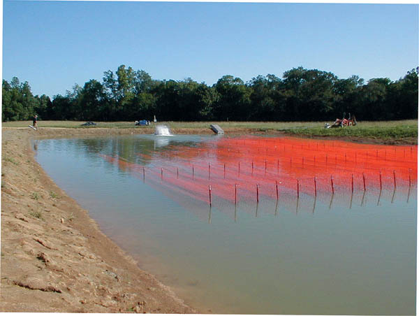 池塘堤岸(有时被称为堤坝或筑堤)的高度必须超出池塘预计最高水位30-60厘米。因此,在一个浅水端水深为65厘米,深水端水深为115厘米的池塘中,整个堤岸的高度必须至少为0.95米(入口处)到1.45米(出口处)。池塘堤岸的高度还必须能够保护池塘不受外部洪水侵袭。在修建池塘堤岸和处理池底时,必须采取压实的办法,以保证获得最高保水性。在修筑池塘堤岸时,如果当地土壤的保水性不好,那么就必须从外部获取材料修建防渗心墙,此心墙应当延伸至池塘底部以下(图45)。