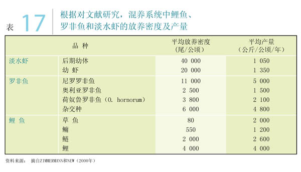 热带混养和综合养殖:200-300公斤/公顷(孟加拉国);200-500公斤/公顷 (印度);200-300公斤/公顷(越南)。