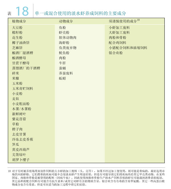 若在养殖场生产自制的饲料,可以利用多种不同的单一或组合原料,制作“配合饲料”。用于淡水虾的商业饲料一般使用供应量大的配料;其中许多是全球性商品,如鱼粉或大豆粉。也可以在养殖场生产的饲料中添加一些这类成分,如本手册所介绍的配方。此外,可以使用所谓的“非传统饲料”(即通常在商业饲料中不常用的饲料,因为其供应数量小,往往只是地方性和季节性地供货);其中一些成分列于表18。除了“垃圾”鱼以外、软体动物和虾的废弃物构成了宝贵的动物蛋白来源。用印茄(银合欢属)叶制成的粉料含有虾类食物的要素,但是使用时要注意含羞草氨酸的毒性,它的使用在饲养陆生动物时造成问题。一些虾农在其池塘中加入其他材料,包括猪粪(在民族文化上可以接受的地方,它被作为饲料而不是肥料)和池塘外围养鸡场的死鸡。当地其他可获得的原料或许也很不错。