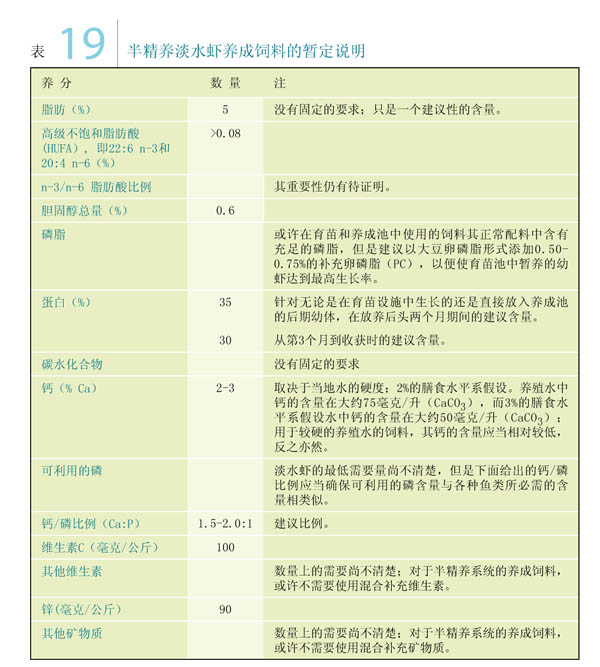 因为已经有了其他的出版物,本手册不再论述养殖场自制饲料的制作方法。粮农组织的另一本手册(New,1987年)提供了详细的资料,而关于养殖场自制的水产饲料的一般使用方法在New、Tacon和Csavas(1995年)的论著中进行了讨论。如果自己配制饲料,有必要[通过分析和/或查阅出版信息(Fonnesbeck、Harris和Kearl,1977年;Gohl,1981年;New,1987年;Tacon,1987年、1993年a、1993年b)]确定当地可获得的配料成分。淡水虾养成饲料的某些具体说明列于表19。最近(匿名,2001年a),有报道说在印 度科钦启动了一个配备了饲料机的养殖场水产饲料制作点。在这里,虾农可以使用公共设备,制作他们自己的饲料。于1992年在泰国召开的一次会议上推荐了这一发展举措(New、Tacon和Csavas,1995年),并且希望将出现更多这样的单位,帮助小型虾农制作自己的廉价饲料。然而,如果不准备自己生产饲料,那么请向当地水产饲料制造商咨询,了解他们是否生产淡水虾饲料。他们会很乐意提供帮助。
